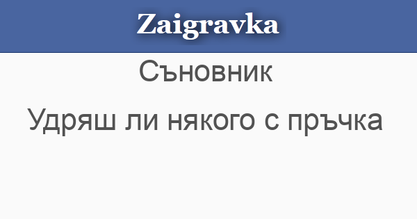 Заигравка » Съновник » Удряш ли някого с пр абвгдежзийклмнопрстуфхцчшщъьюя Удряш ли някого с пръчка • Удряш ли някого с пръчка - обуздай гнева си, защото ще стане причина за някакво нещастие. « Предишна Следваща »