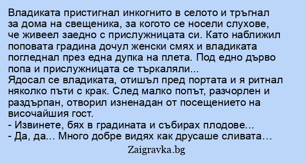 Владиката пристигнал инкогнито в селото и тръгнал за дома на свещеника, за когото се носели слухове, че живеел заедно с прислужницата си. Като наближил поповата градина дочул женски смях и владиката погледнал през една дупка на плета. Под едно дърво попа и прислужницата се търкаляли...