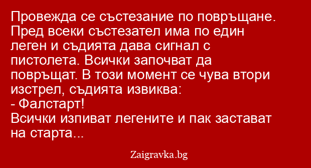 Провежда се състезание по повръщане. Пред всеки състезател има по един леген и съдията дава сигнал с пистолета. Всички започват да повръщат. В този момент се чува втори изстрел, съдията извиква: