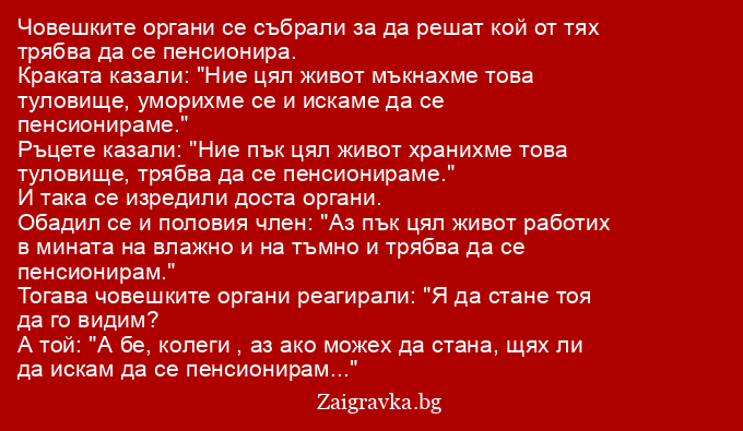 Обадил се и половия член: "Аз пък цял живот работих в мината на влажно и на тъмно и трябва да се пенсионирам."