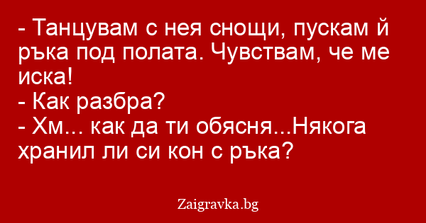 - Танцувам с нея снощи, пускам й ръка под полата. Чувствам, че ме иска!