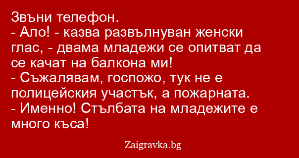 - Ало! - казва развълнуван женски глас, - двама младежи се опитват да се качат на балкона ми!