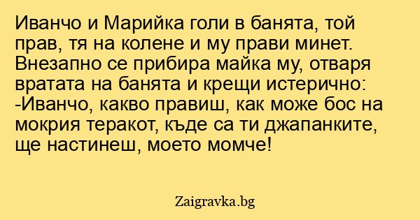 -Прибирам се вчера и кво мислиш! Моят Иванчо в кухнята, смъкнал панталона, лъска чикия и тъкмо вече забелва очите. Аз светкавично клекнах пред него и му го лапнах!