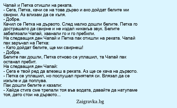 Качил се Петка на дървото. След малко дошли белите. Петка го дострашало да свирне и не издал никакъв звук. Белите забелязали Чапай, хванали го и го пребили.