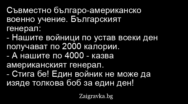 - Стига бе! Един войник не може да изяде толкова боб за един ден!