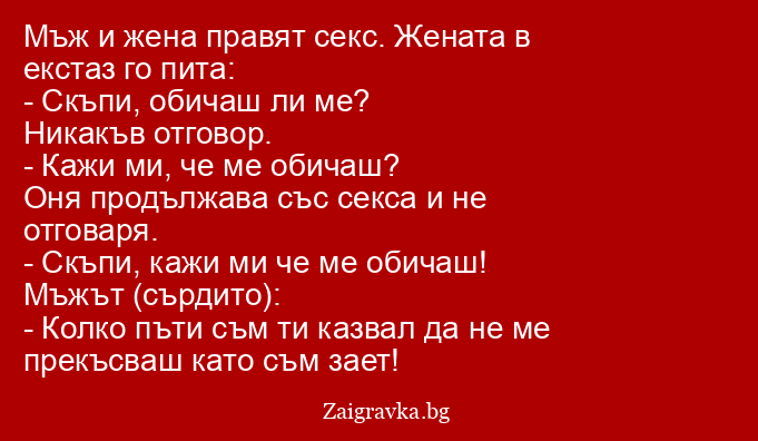 Семейство в леглото. Правят секс. Мъжът свършва, обръща се и се приготвя да заспи. Жена му недоволства: