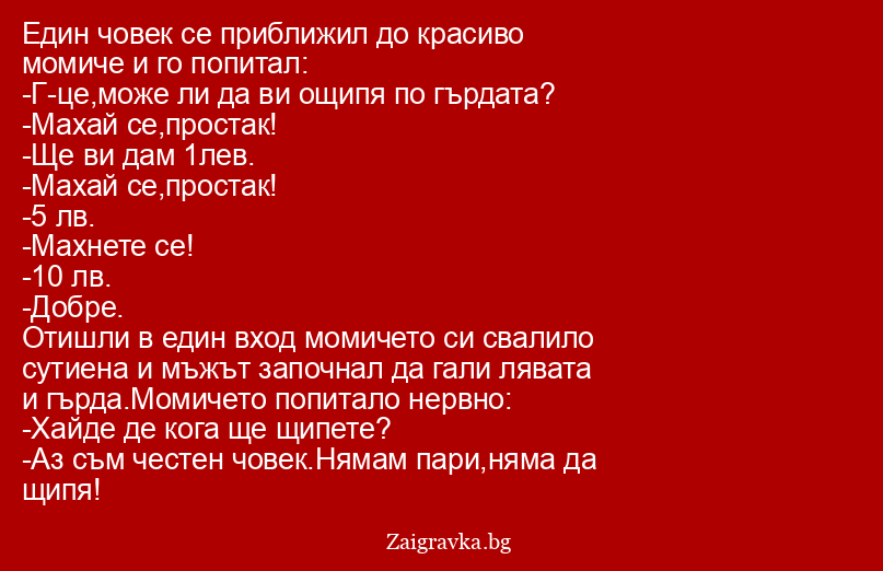 -Аз съм честен човек.Нямам пари,няма да щипя!