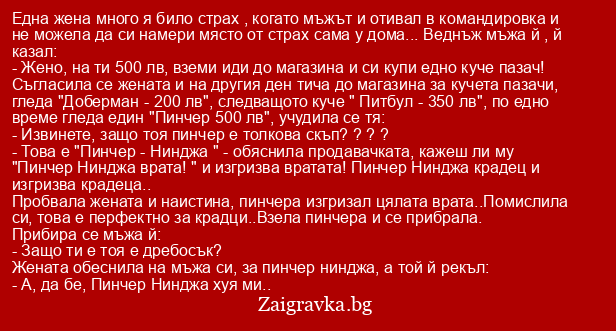 Съгласила се жената и на другия ден тича до магазина за кучета пазачи, гледа "Доберман - 200 лв", следващото куче " Питбул - 350 лв", по едно време гледа един "Пинчер 500 лв", учудила се тя: