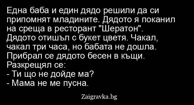 Една баба и един дядо решили да си припомнят младините. Дядото я поканил на среща в ресторант "Шератон". Дядото отишъл с букет цветя. Чакал, чакал три часа, но бабата не дошла. Прибрал се дядото бесен в къщи. Разкрещял се: