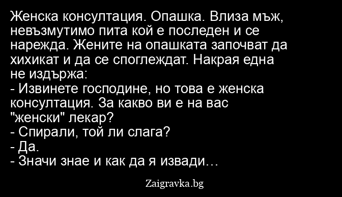 - Извинете господине, но това е женска консултация. За какво ви е на вас "женски" лекар?