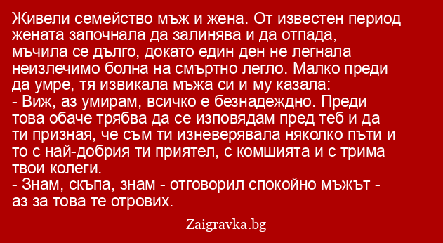 - Знам, скъпа, знам - отговорил спокойно мъжът - аз за това те отрових.