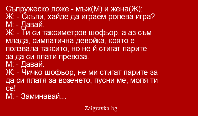 Ж: - Ти си таксиметров шофьор, а аз съм млада, симпатична девойка, която е ползвала таксито, но не й стигат парите за да си плати превоза.