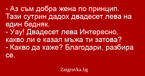 - Аз съм добра жена по принцип. Тази сутрин дадох двадесет лева на един бедняк.