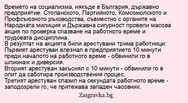 Времето на социализма, някъде в България, държавно предприятие. Стопанското, Партийното, Комсомолското и Профсъюзното ръководства, съвместно с органите на Народната милиция и Държавна сигурност провели масова акция по проверка спазване на работното време и трудовата дисциплина.