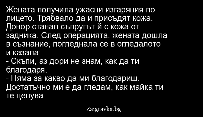 Жената получила ужасни изгаряния по лицето. Трябвало да и присъдят кожа. Донор станал съпругът й с кожа от задника. След операцията, жената дошла в съзнание, погледнала се в огледалото и казала: