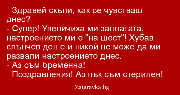 - Супер! Увеличиха ми заплатата, настроението ми е "на шест"! Хубав слънчев ден е и никой не може да ми развали настроението днес.