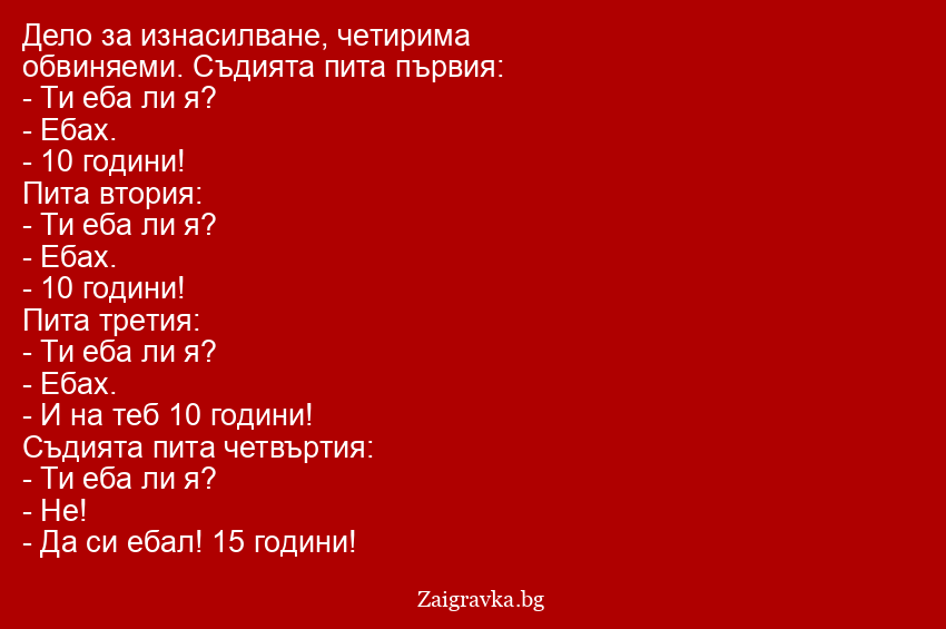 Дело за изнасилване, четирима обвиняеми. Съдията пита първия: