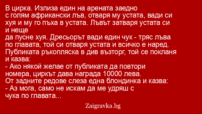 да пусне хуя. Дресьорът вади един чук - тряс лъва по главата, той си отваря устата и всичко е наред. Публиката ръкопляска в див възторг, той се покланя и казва: