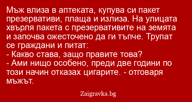 Мъж влиза в аптеката, купува си пакет презервативи, плаща и излиза. На улицата хвърля пакета с презервативите на земята и започва ожесточено да ги тъпче. Трупат се граждани и питат: