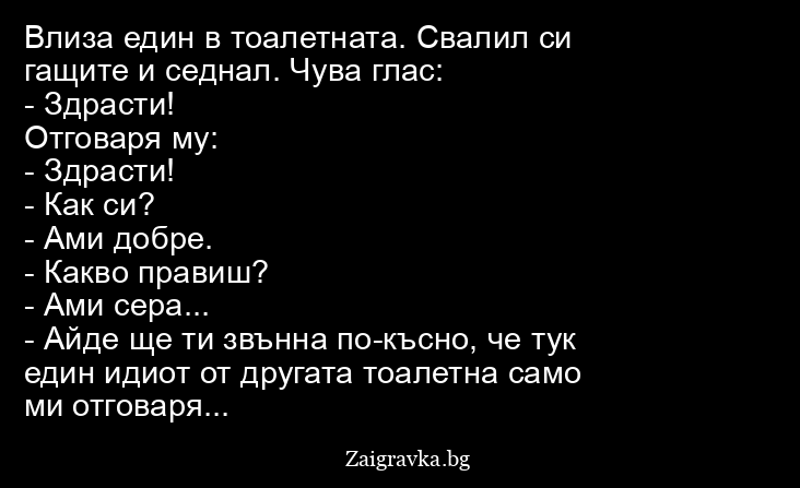 Влиза един в тоалетната. Свалил си гащите и седнал. Чува глас: