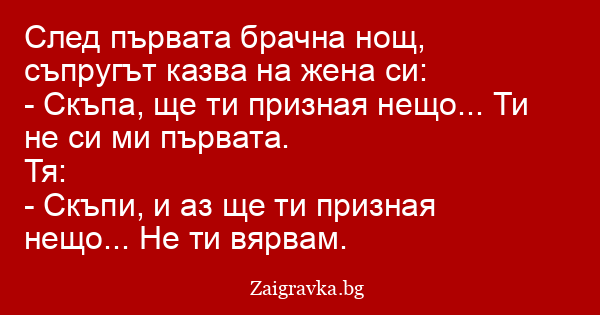 - Знаеш ли, снощи на купона така се напих, че на сутринта се оказах в леглото със собствения си мъж!