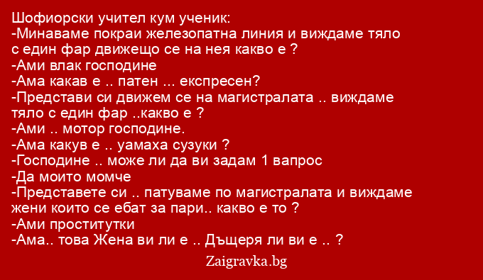 -Представете си .. патуваме по магистралата и виждаме жени които се ебат за пари.. какво е то ?