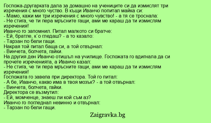 Госпожа-другарката дала за домашно на учениците си да измислят три изречения с много чуство. В къщи Иванчо попитал майка си: