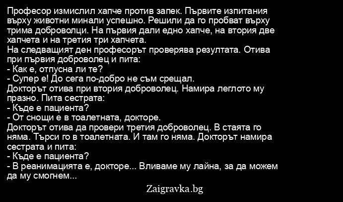 Професор измислил хапче против запек. Първите изпитания върху животни минали успешно. Решили да го пробват върху трима доброволци. На първия дали едно хапче, на втория две хапчета и на третия три хапчета.