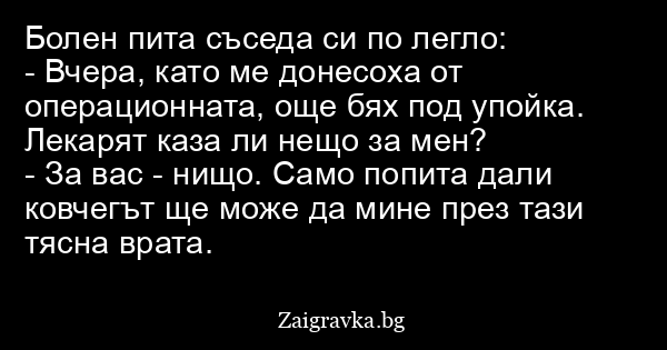 - Вчера, като ме донесоха от операционната, още бях под упойка. Лекарят каза ли нещо за мен?