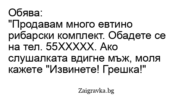 "Продавам много евтино рибарски комплект. Обадете се на тел. 55ХХХХХ. Ако слушалката вдигне мъж, моля кажете "Извинете! Грешка!"