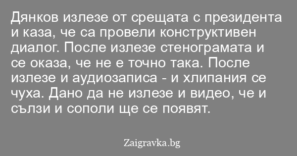 Дянков излезе от срещата с президента и каза, че са провели конструктивен диалог. После излезе стенограмата и се оказа, че не е точно така. После излезе и аудиозаписа - и хлипания се чуха. Дано да не излезе и видео, че и сълзи и сополи ще се появят.