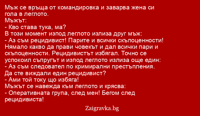 Нямало какво да прави човекът и дал всички пари и скъпоценности. Рецидивистът избягал. Точно се успокоил съпругът и изпод леглото излиза още един: