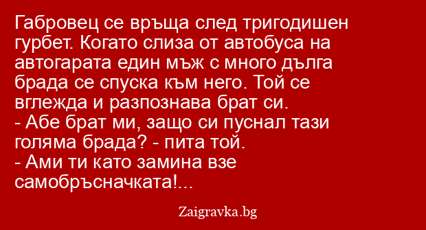 Габровец се връща след тригодишен гурбет. Когато слиза от автобуса на автогарата един мъж с много дълга брада се спуска към него. Той се вглежда и разпознава брат си.