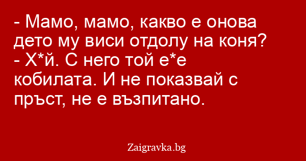 - Мамо, мамо, какво е онова дето му виси отдолу на коня?