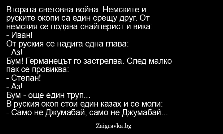 Втората световна война. Немските и руските окопи са един срещу друг. От немския се подава снайперист и вика: