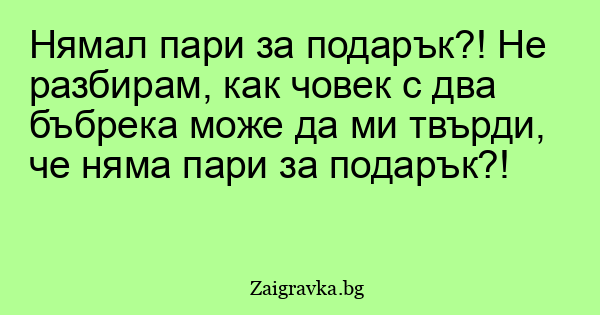 Нямал пари за подарък?! Не разбирам, как човек с два бъбрека може да ми твърди, че няма пари за подарък?!