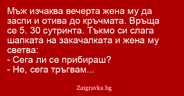 Мъж изчаква вечерта жена му да заспи и отива до кръчмата. Връща се 5. 30 сутринта. Тъкмо си слага шапката на закачалката и жена му светва: