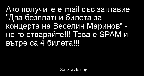 Ако получите e-mail със заглавие "Два безплатни билета за концерта на Веселин Маринов" - не го отваряйте!!! Това е SPAM и вътре са 4 билета!!!