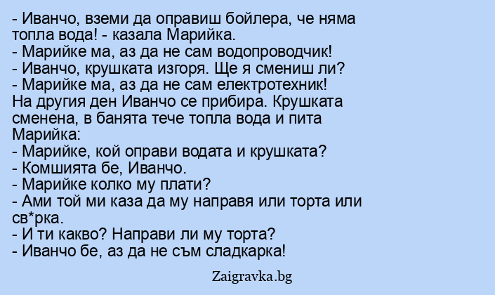 - Иванчо, вземи да оправиш бойлера, че няма топла вода! - казала Марийка.
