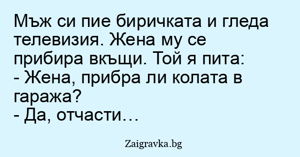 Мъж си пие биричката и гледа телевизия. Жена му се прибира вкъщи. Той я пита: