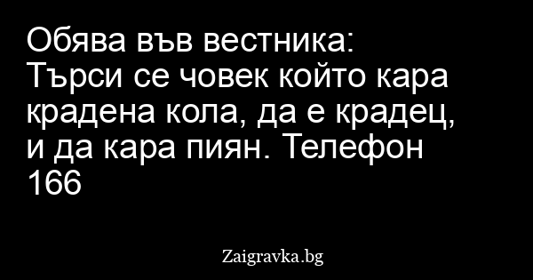 Търси се човек който кара крадена кола, да е крадец, и да кара пиян. Телефон 166