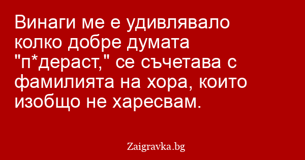 Винаги ме е удивлявало колко добре думата "п*дераст," се съчетава с фамилията на хора, които изобщо не харесвам.