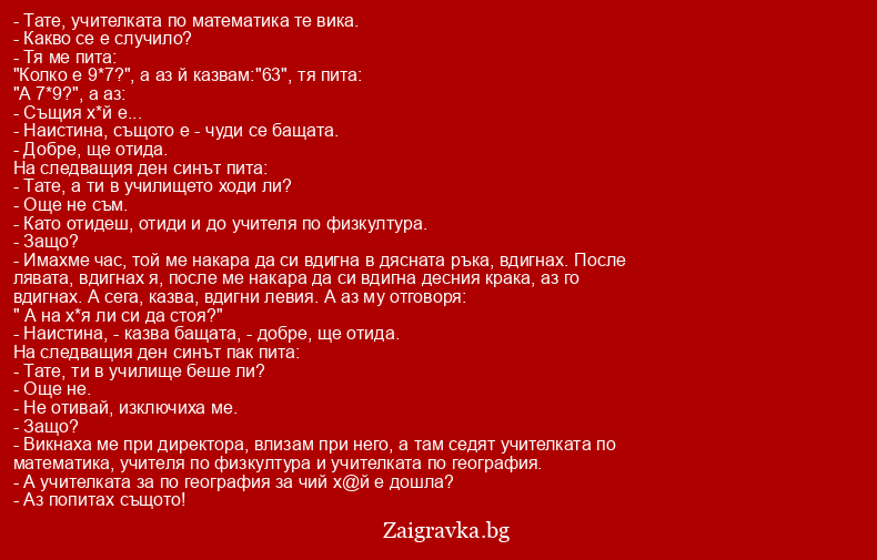 - Викнаха ме при директора, влизам при него, а там седят учителката по математика, учителя по физкултура и учителката по география.