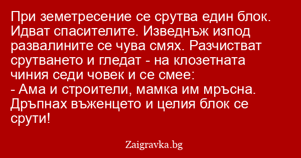При земетресение се срутва един блок. Идват спасителите. Изведнъж изпод развалините се чува смях. Разчистват срутването и гледат - на клозетната чиния седи човек и се смее: