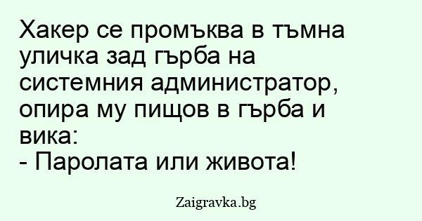 Хакер се промъква в тъмна уличка зад гърба на системния администратор, опира му пищов в гърба и вика: