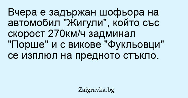 Вчера е задържан шофьора на автомобил "Жигули", който със скорост 270км/ч задминал "Порше" и с викове "Фукльовци" се изплюл на предното стъкло.