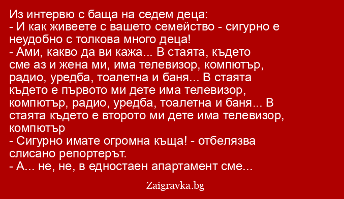 - Ами, какво да ви кажа... В стаята, където сме аз и жена ми, има телевизор, компютър, радио, уредба, тоалетна и баня... В стаята където е първото ми дете има телевизор, компютър, радио, уредба, тоалетна и баня... В стаята където е второто ми дете има телевизор, компютър