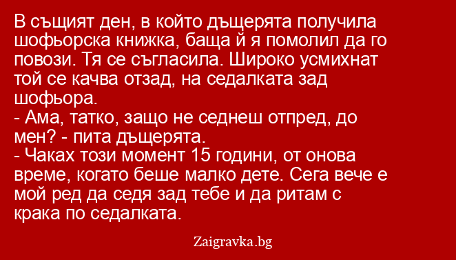 В същият ден, в който дъщерята получила шофьорска книжка, баща й я помолил да го повози. Тя се съгласила. Широко усмихнат той се качва отзад, на седалката зад шофьора.