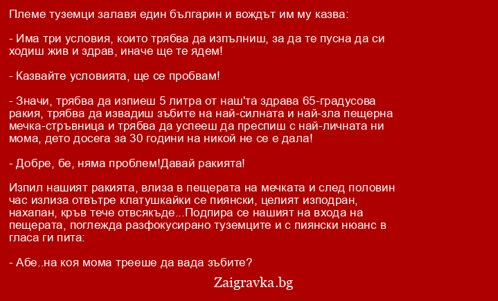 Изпил нашият ракията, влиза в пещерата на мечката и след половин час излиза отвътре клатушкайки се пиянски, целият изподран, нахапан, кръв тече отвсякъде...Подпира се нашият на входа на пещерата, поглежда разфокусирано туземците и с пиянски нюанс в гласа ги пита: