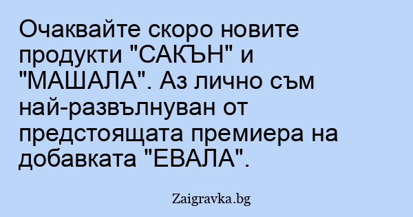 Очаквайте скоро новите продукти "САКЪН" и "МАШАЛА". Аз лично съм най-развълнуван от предстоящата премиера на добавката "ЕВАЛА".